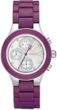 Orologio casual, giapponese movimento al quarzo, cronografo con 24 ore, 30 minuti e secondi cronografici contatori, lucido silver-tone spada mani con accenti luminosi e fucsia secondi continui, lucido silver-tone Lancette contatori, indici di cristallo Applicata, Black arabo numeri e indici segnano contatori, indici neri formano circostante pista minuto, datario analogico alle tre, quadrante bianco madre-perla con argento lucido-tono logo applique, lucido braccialetto di plastica fucsia
